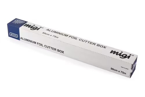 Wholesale Aluminium Foil – Cutter Box of 1 Roll for restaurants, takeaways, cafés and catering. Available option(s): 1 roll Aluminium Foil – Cutter Box 50cm x 75m (11 micron).