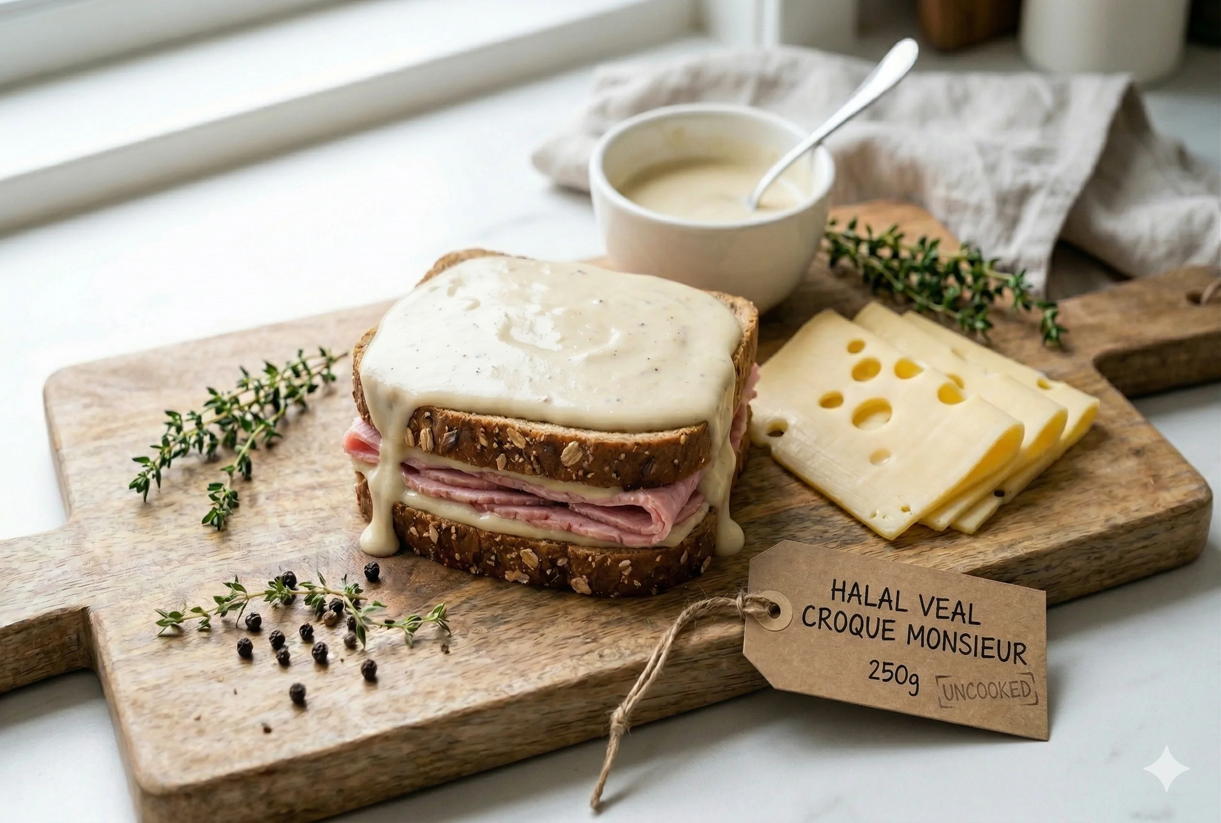 Wholesale Halal Veal Croque Monsieur for restaurants, cafés, takeaways and catering. Available option(s): Pack of 2 × 250g (500g total). Professional kitchen prep and menu service. Halal approved and monitored by Your Halal Guarantee (YHG).