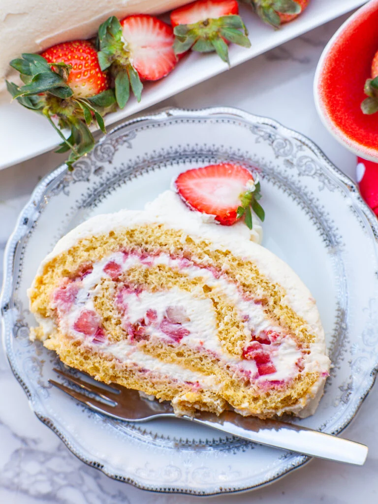 Strawberry swiss roll slices for dessert platters or café counter service.